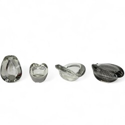 | Omschrijving | Lot van twee dikwandige vazen, waaronder het beukenootje. Hierbij twee dikwandige asbakken met luchtbellen, waaronder Serica 73 met antimooncraquelé. Ontwerp van Floris Meydam voor glasfabriek Leerdam. Ca 1950. |