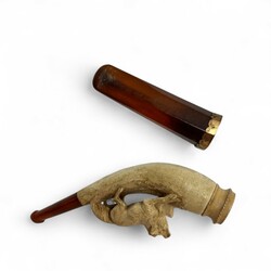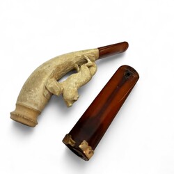 | Omschrijving | Lot van twee antieke pijpjes: één meerschuim pijp met voorstelling van een vosje en één barnstenen pijpje met 14 karaats (585/1000) geelgouden en gegraveerd sierrandje, in foedraal. |