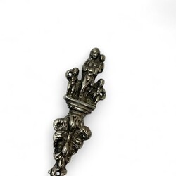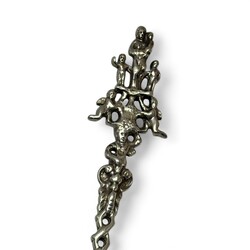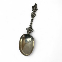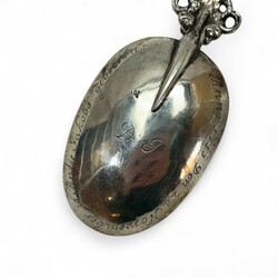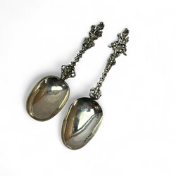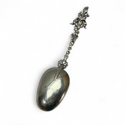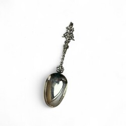 | Omschrijving | Twee geboortelepels: Een antieke eerste gehalte (925/1000) zilveren geboortelepel met getorste steel, bekroond met De Liefde, met daaronder twee putti’s. Gemaakt voor de export naar Engeland, gekeurd voor Samuel Boyce Landeck, Sheffield 1897. Op de achterzijde van de bak met pseudokeuren. En Een antieke 18e eeuwse geboortelepel, getorste steel, bekroond met de Liefde (moeder met kinderen). Op de achterzijde met inscriptie ‘D.J.’ en tekst ‘anno 1713 Den 24 November is Antje Jakobs geboren’. Met onduidelijk afgeslagen meesterteken. |
