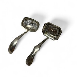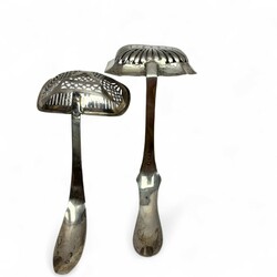 | Omschrijving | Twee zilveren strooilepels, resp. empire en biedermeier model. |