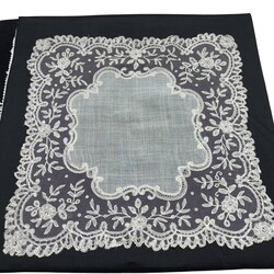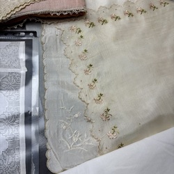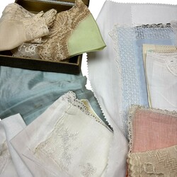 | Omschrijving | Grote verzameling antieke zakdoeken. Onder andere dertien 19e eeuwse exemplaren met Valencienne kant, diverse buitenlandse exemplaren, één gemerkt ‘Casino Neris’, ook België, Frankrijk en Malta. Daarbij ook twee 19e eeuwse kanten zakdoeken, vermoedelijk Honiton, Engeland 19e eeuw. |