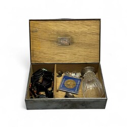 | Omschrijving | Een 20e eeuwse verzilverde tabaksdoos, gevuld met diversen. Onder andere een collier, medaille jubileum Wilhelmina 1898-1948, twee 18e eeuwse VOC munten, munt ‘William and Mary Tercentenary 1688-1998’, vijf tweede gehalte (835/1000) zilveren theelepels, van Kempen en een 14 karaats (585/1000) geelgouden dasspeld met steentje. |