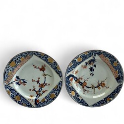 | Omschrijving | Set van vier 18e eeuwse Chinees porseleinen borden met meerkleurige decoratie, o.a. bloem- en takmotieven in cartouches binnen een blauwe geschulpte rand. |