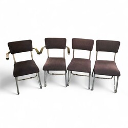 | Omschrijving | Vier buizen stoelen, waarvan twee met armleuningen. Alle vier met zwarte ribstof bekleed. Ontwerper onbekend. |