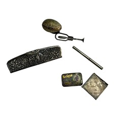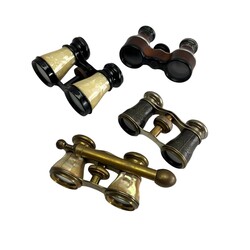 | Omschrijving | Lot van vier antieke toneelkijkers, o.a. ingelegd met parelmoer en één met jachtvoorstellingen. Met daarbij een avondtasje met opengewerkte alpaca beugel, verzilverd doosje, kammetje, een vingerhoedje in koperen foedraal, rozenkrans etc. |