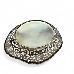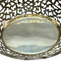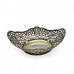 | Omschrijving | Een 20e eeuws eerste gehalte (925/1000) zilveren bonbonmandje, groot formaat. Ajour gezaagd, met gecontourneerde rand, versierd met parelrand. Gekeurd met staande leeuw, minervakopje, jaarletter K (1994) en meester- of importeursteken DA+ = Aubert, Den Haag. |