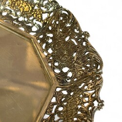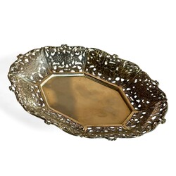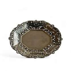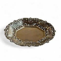 | Omschrijving | Een 20e eeuws tweede gehalte (835/1000) zilveren bonbonschaaltje. Achtkantig model, gedeeltelijk opengewerkt, met florale motieven. Aan de achterzijde gemerkt met lopende leeuw en meesterteken BWE = B.W. van Eldik, Zutphen. Tevens gekeurd met minervakopje en jaarletter Z (1934). |