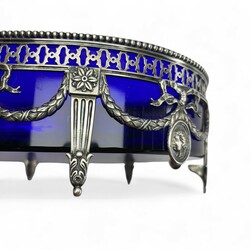 | Omschrijving | Zilveren jardiniere met blauwglazen binnenbak en geplaatst op zes pootjes, versierd met guirlandes. |