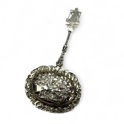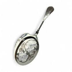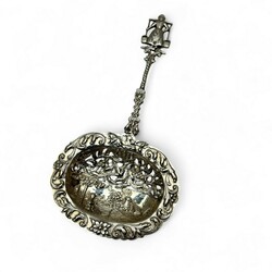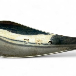 | Omschrijving | Lot: een 20e eeuwse tweede gehalte (835/1000) zilveren natfruitschep, meesterteken D1, jaarletter B (1911). En een antieke 19e eeuwse tweede gehalte (835/1000) zilveren pasteischep, getorste steel, gegraveerd op de bak en steel. Onduidelijk meesterteken, jaarletter B (1886). |