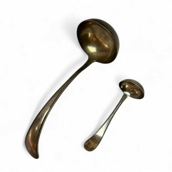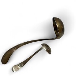 | Omschrijving | Een 20e eeuwse tweede gehalte (835/1000) zilveren opdienlepel en juslepel, beide versierd met parelrand. Gekeurd met lopende leeuw, minervakopje, jaarletter 1908, meesterteken onduidelijk. |