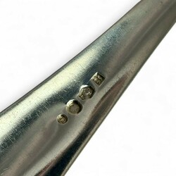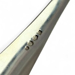 | Omschrijving | Een antiek vroeg 20e eeuws tweede gehalte (835/1000) zilveren slacouvert, Haags Lof. Mr. van Kempen, jaarletter 1908. |