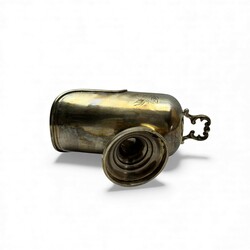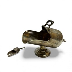 | Omschrijving | Een 20e eeuwse tweede gehalte (835/1000) zilveren suikerbak, model kolenkit. Op ronde voet, gegraveerd, met grepen aan de boven- en achterkant, en met bijpassend schepje. Gemerkt ‘835’ en ‘ZII’ importkeur |