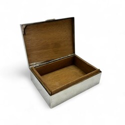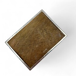 | Omschrijving | Een 20e eeuwse tweede gehalte (835/1000) zilveren tabaksdoos. Vierkant model met houten interieur. Aan de onderzijde gekeurd met lopende leeuw, minervakopje, meesterteken AP3 = A. Presburg, Haarlem en jaarletter N (1948) |