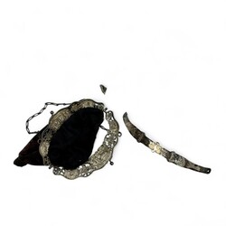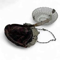 | Omschrijving | Een stoffen tas met Amsterdamse School motieven, aan een 20e eeuwse tweede gehalte (835/1000) zilveren tasbeugel, gedeeltelijk opengewerkt, met voorstelling van Hollandse landschappen, bloemenmanden en ‘de Stier’ van Paulus Potter. Gemerkt met minervakopje en jaarletter G (1916). Met daarbij een antiek kristallen schaaltje met olijf- en sterslijpsel, met tweede gehalte (835/1000) zilveren beugel, gemaakt van bijbelslot. Met oude stippelgravure ‘Rienstra’ en datering 1851. |