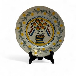 | Omschrijving | Een antiek 18e eeuws Delfts aardewerk bord, polychroom beschilderd met Nederlandse vlag en appelboom. En tekst ‘VVOR’. |