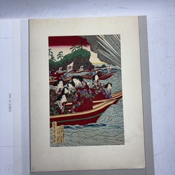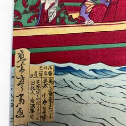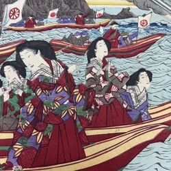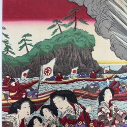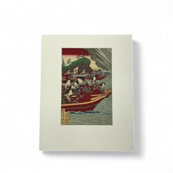 | Omschrijving | Een antieke 19e eeuwse Japanse kleurenhoutsnede, voorstelling van hofdames in een schip, kijkend naar oefeningen. Door Shinsai, 1879 (Meiji periode). |