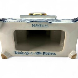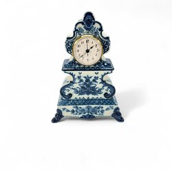 | Omschrijving | Een 20e eeuwse aardewerken pendule, met blauw floraal decor. Aan de onderzijde gemerkt ‘Makkum’ en ‘Dinie Postma’. In de avonduren gemaakt bij Tichelaar Makkum. Met quartz uurwerk. |