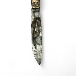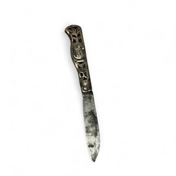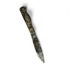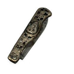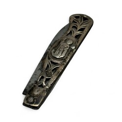| Omschrijving | Een antiek vroeg 19e eeuws Fries tweede gehalte (835/1000) zilveren zakmesje. Opengewerkte greep, versierd met medaillons aan beide zijden, mogelijk apostels. Gemerkt met minervakopje. Vermoedelijk ca. 1820. |