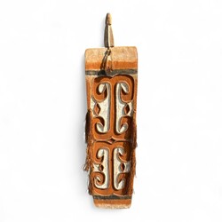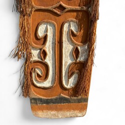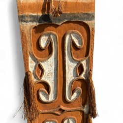 | Omschrijving | Een 20e eeuws beschilderd gestoken houten schild, versierd met geometrisch snijwerk en oranje-witte pigmenten. Sepik, Papoea-Nieuw Guinea. |