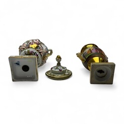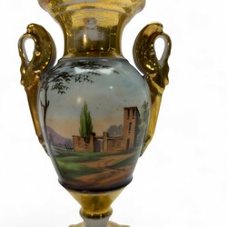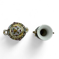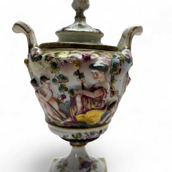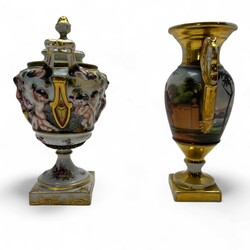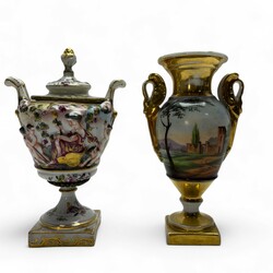 | Omschrijving | Lot van twee stuks 19e eeuws porselein: een Capodimonte dekselvaasje, handbeschilderd met decor van figuren in reliëf. En een Empire stijl vaasje, Porcelaine de Paris, ca. 1820-1840. |