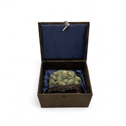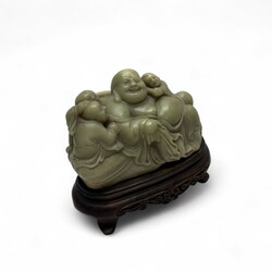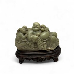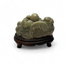 | Omschrijving | Chinees speksteen sculptuur van een boeddha met kinderen, 19e eeuw, op gestoken houten basement, in gestoffeerde doos met sticker ‘Shanghai Museum’ |