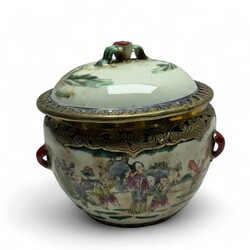 | Omschrijving | Chinees porseleinen dekselpot met polychroom decor van spelende zotjes, gedecoreerd met gegraveerde metalen monturen, onderop een stempelmerk met zes karakters, 20e eeuw, en Chinees porseleinen famille rose vierlaagse stapeldoos, 19e/20e eeuw |