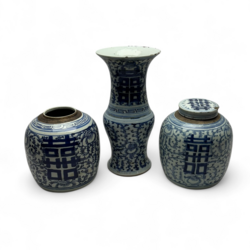 | Omschrijving | Twee Chinees porseleinen gemberpotten met floraal decor en karakters, waarvan één met deksel, en vaas met uitlopende hals en vergelijkbaar decor, alle drie 19e/begin 20e eeuw |