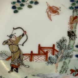 | Omschrijving | Chinees porseleinen kop-en-schotel met polychroom decor van een boogschutter in tuinlandschap, niet gemerkt, mogelijk Qianlong |