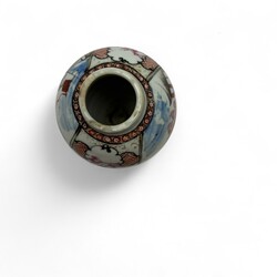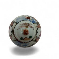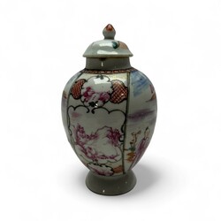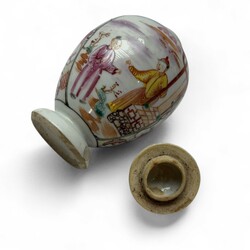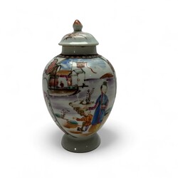 | Omschrijving | Een antiek 18e eeuws Chinees porseleinen Mandarijn theebusje, Qianlong periode (1735-1796), met decor van figuren en landschappen. Deksel niet bijpassend. |