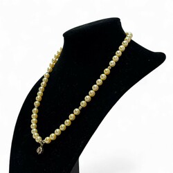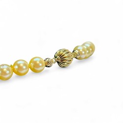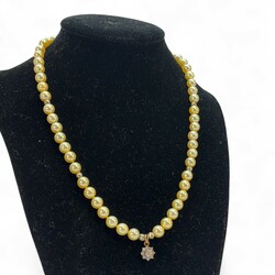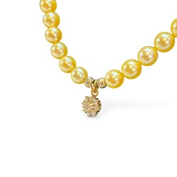 | Omschrijving | Collier met zachtgele parels en 14 karaats gouden hangertje ingelegd met 9 briljantjes, aan 14 karaats (585 gemerkt) gouden bolslot |
