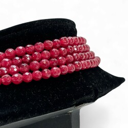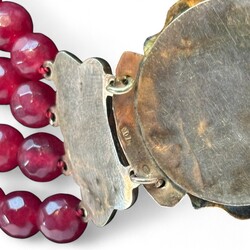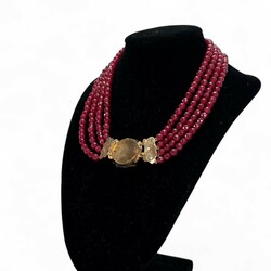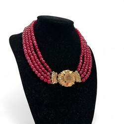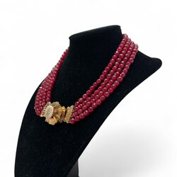 | Omschrijving | Vierstrengs collier met cranberryrode geslepen granaatjes, met 14 karaats (gemerkt eikenblad) gouden sluiting |