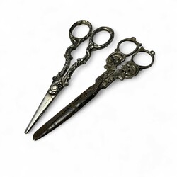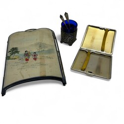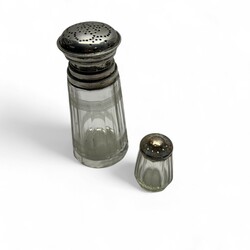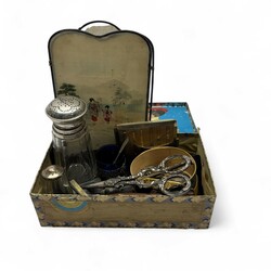 | Omschrijving | Divers kleingoed, waaronder: glazen strooier met tweede gehalte zilveren dop, porseleinen dobbelstenen, twee cachets, antiek glazen doosje met messing omlijsting, de spiegelende deksel met Duits opschrift, vermoedelijk 18e eeuw, paar tweede gehalte zilveren vleesvorkjes |