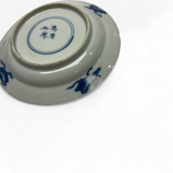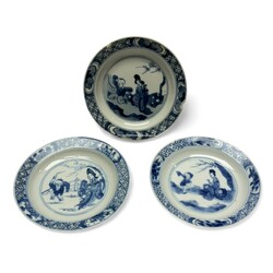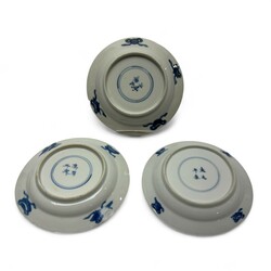 | Omschrijving | Drie Chinees porseleinen schoteltjes met blauw-wit decor: dansend zotje bij een geisha, de rand met servetwerk, met vier karakters gemerkt, 19e eeuw |