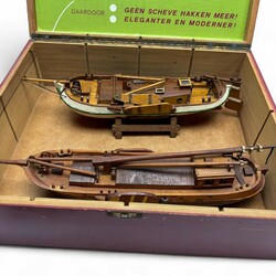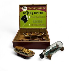 | Omschrijving | Drie scheepsmodellen: Lemsteraak, Bakdekkruiser, en klipperaak, op basementjes, daarbij: scheepsmodel: gemotoriseerde Friese maatkast, in glazen fles, op basement |