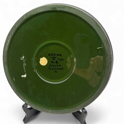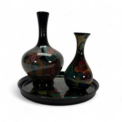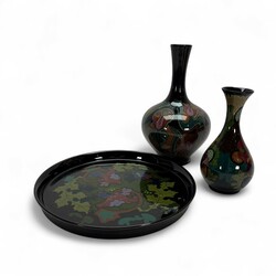 | Omschrijving | Lot van drie stuks glansplateel: een dienblad, gemerk Regina Gouda, een trompetvormige vaas, gemerkt Zuid-Holland, Gouda en een art nouveau stijl vaas, Royal Goedewaagen. |
