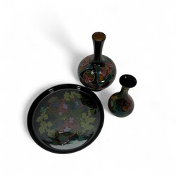 | Conditie | Dienblad met lichte beschadigingen aan glazuur, vazen in goede staat |