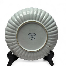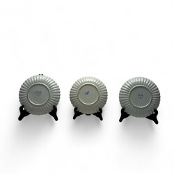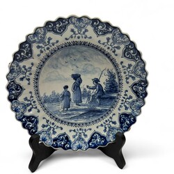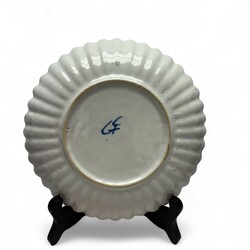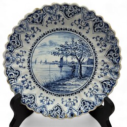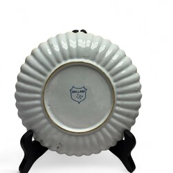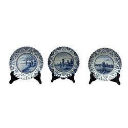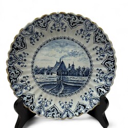 | Omschrijving | Lot van drie vroeg 20e eeuwse kleine plooischotels, met blauw-wit decors van een huisje, een visser en drie figuren. Allen gemerkt Tichelaar, Makkum. |