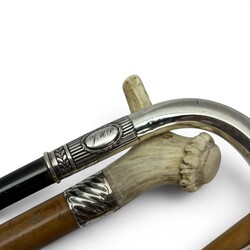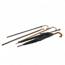 | Omschrijving | Drie wandelstokken en twee paraplu's. Twee met 3e gehalte (800/1000) zilveren heften. en 1 met zilveren applicatie. |