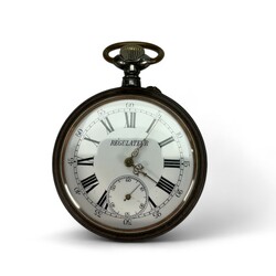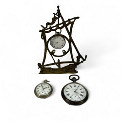 | Omschrijving | Lot van drie zakhorloges: een groot treinzakhorloge, één gemerkt Roskopf en één in zilveren kast, hangend in een metalen zakhorlogehouder |
