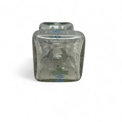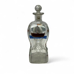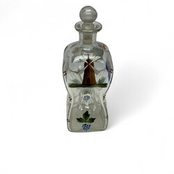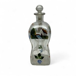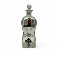 | Omschrijving | Een antieke 19e eeuwse karaf of knijpfles met emaille decor van schepen, molen, vis in het water en huisje bij een rivier |