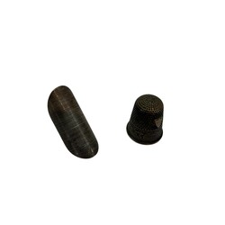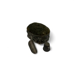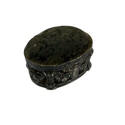 | Omschrijving | Een lot bestaande antiek speldenkussen in tweede gehalte (835/1000) zilveren montuur, hierbij een tweede gehalte (835/1000) zilveren empire naairing en een vingerhoed |