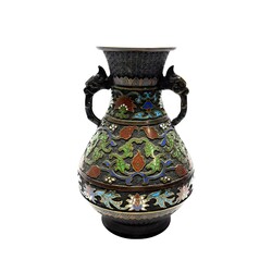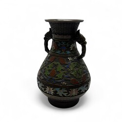 | Omschrijving | Een Chinees gepatineerd bronzen vaas met rondom cloisoné polychroom florale motieven, 31 cm hoog. Met fenix vormige oren. Ca 1900. |