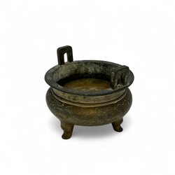 | Omschrijving | Een messing rond wierook brander/vat. Rond gegraveerd model met drakendecor rondom. rustend op drie bolvoetjes. gemerkt met zes karaktertekens. 20e eeuws. |
