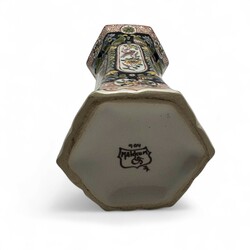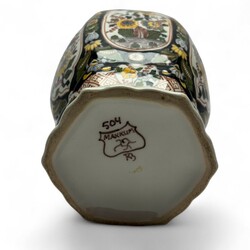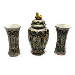 | Omschrijving | Een driedelig aardewerk Tichelaar, Makkum kastsstel. Polychroom beschilderd met cartouches met floraal en vogel decor. Gemerkt. |