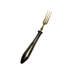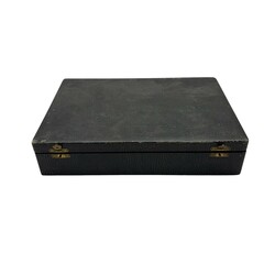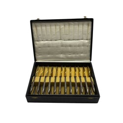 | Omschrijving | Een Duits twaalfdelig verguld fruitbestek bestaande uit 12 messen en 12 vorken aan 3e gehalte (800/1000) zilveren heften met parelrand. In originele cassette. |