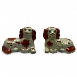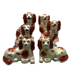 | Omschrijving | Zes Engelse aardewerk Staffordshire hondenbeeldjes: Cavalier-king charles spaniëls met rode vacht, waaronder een paar liggende honden, 19e eeuw |
