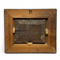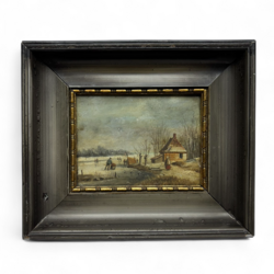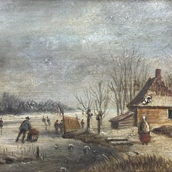 | Omschrijving | Schilderij, olieverf op paneel. IJsgezicht met schaatsende figuren en een koek-en-zopie tent. Ongesigneerd, Hollandse School 19e eeuw. |