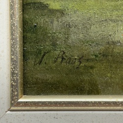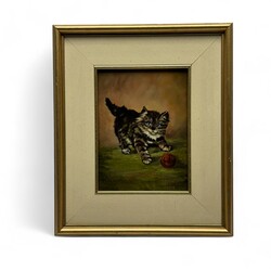 | Omschrijving | Hollandse School: poesje spelend met bolletje wol, olieverf op paneel, linksonder gesigneerd [N. Praag?] |