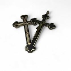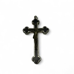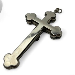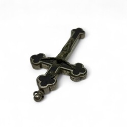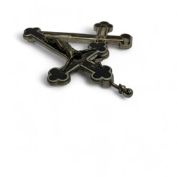 | Omschrijving | Metalen kruisvormig relikwieën houder, ingelegd met ebbenhout, aan de voorzijde gedecoreerd met Christus aan het kruis, het interieur met uitneembaar beglaasd kruisje waarin kleine opgeplakte steentjes en stukjes perkament, openen/sluiten door middel van schroef knop |