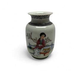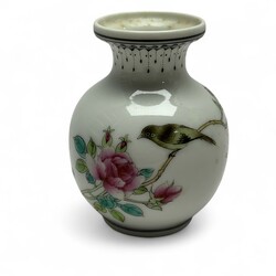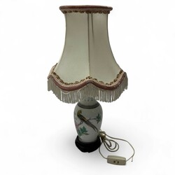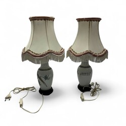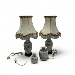 | Omschrijving | Lot van vier stuks 20e -eeuws Chinees porselein, PROC periode. Twee losse vaasjes, één met decor van een vogel op tak bij een bloem en één met zittende vrouw. Beide gemerkt met zegelmerk. Met daarbij twee vazen, tevens met decor van vogels op een tak, verbouwd tot lamp, op zwarte sokkels, met stoffen kapjes. |